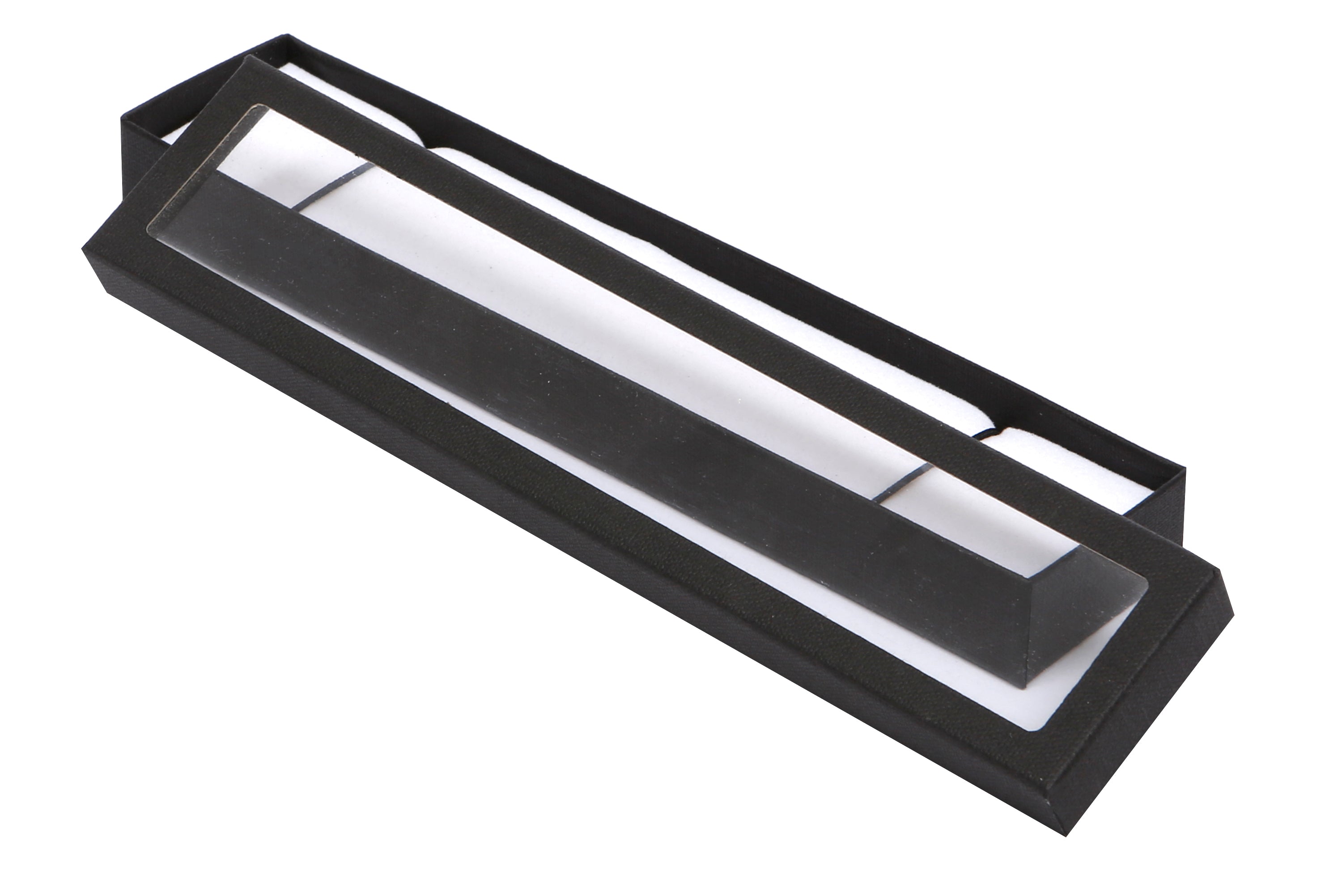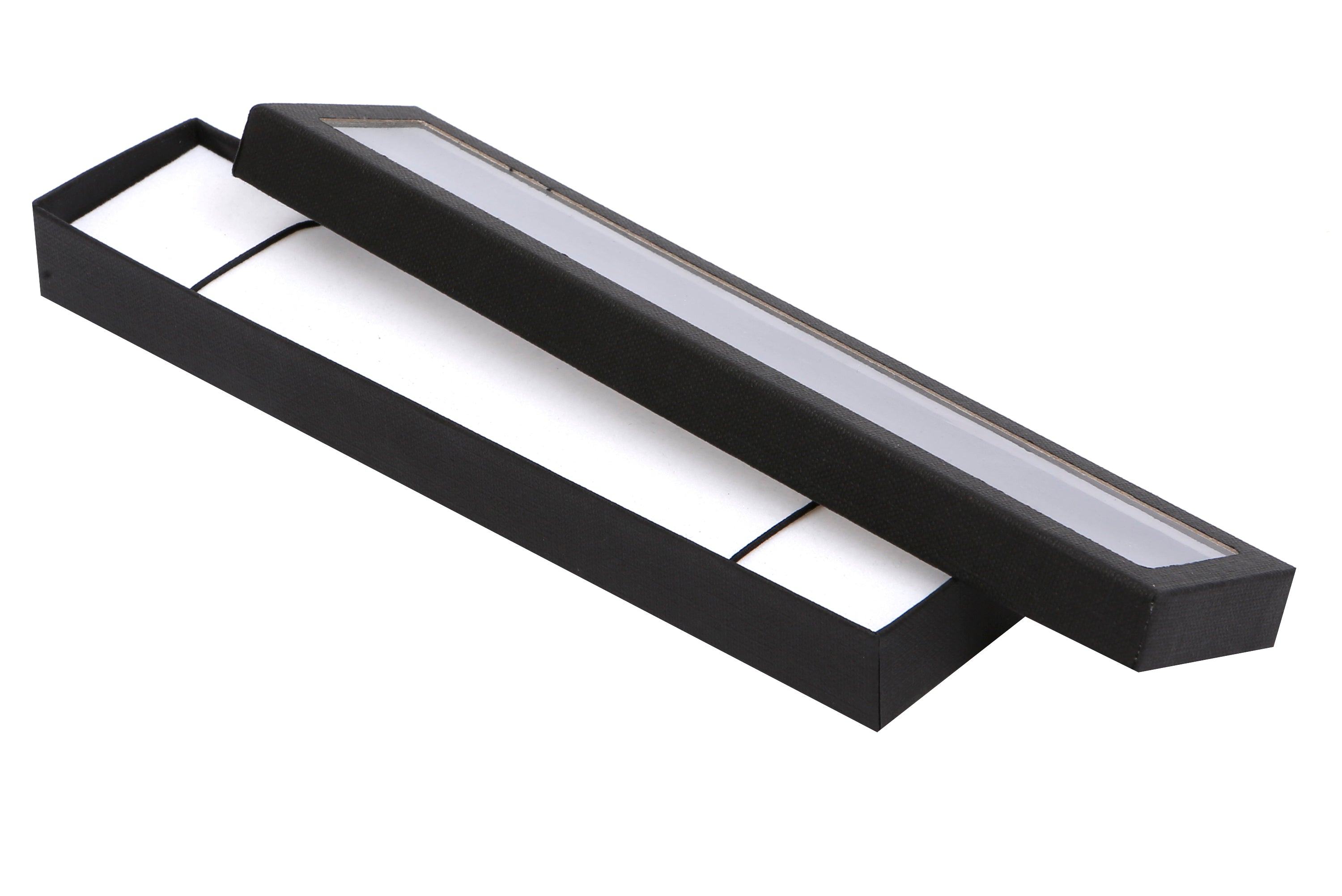 This bracelet box has elastics at either end of the base pad to hold the product in place. This box is also be used for pens and narrow watches.