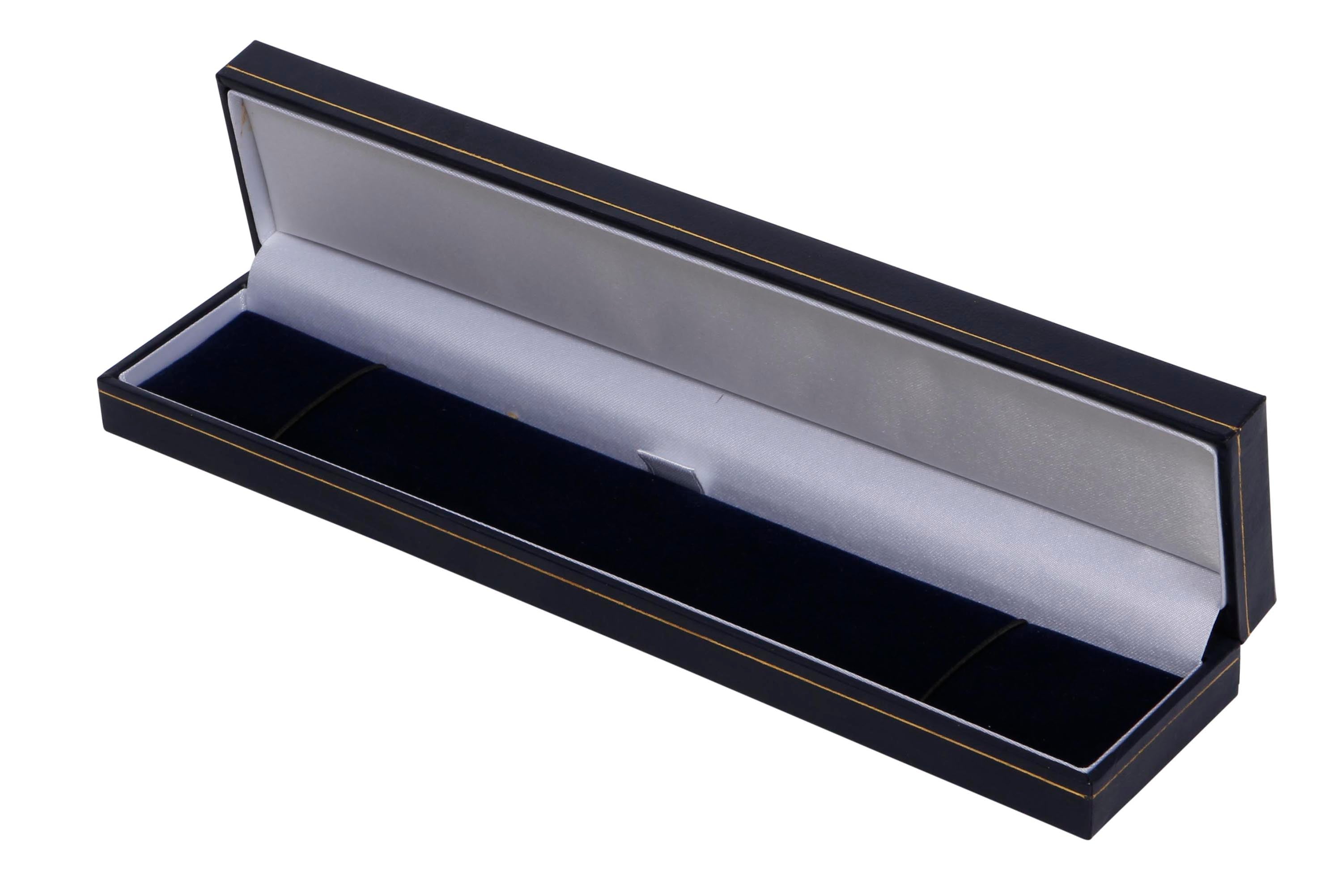 Classical leatherette covered collection of jewellery boxes, available in different colour outer materials. The boxes have gold tooling on the lid and around the box adding style and elegance to an old favourite. The interior is a white satin liner and velvet base. The boxes are supplied with white protective sleeves. The collection can be printed on the inside lid liner or on the side of the sleeve. A very popular and competitively priced collection of boxes that has defied time and is still as popular as ever.