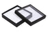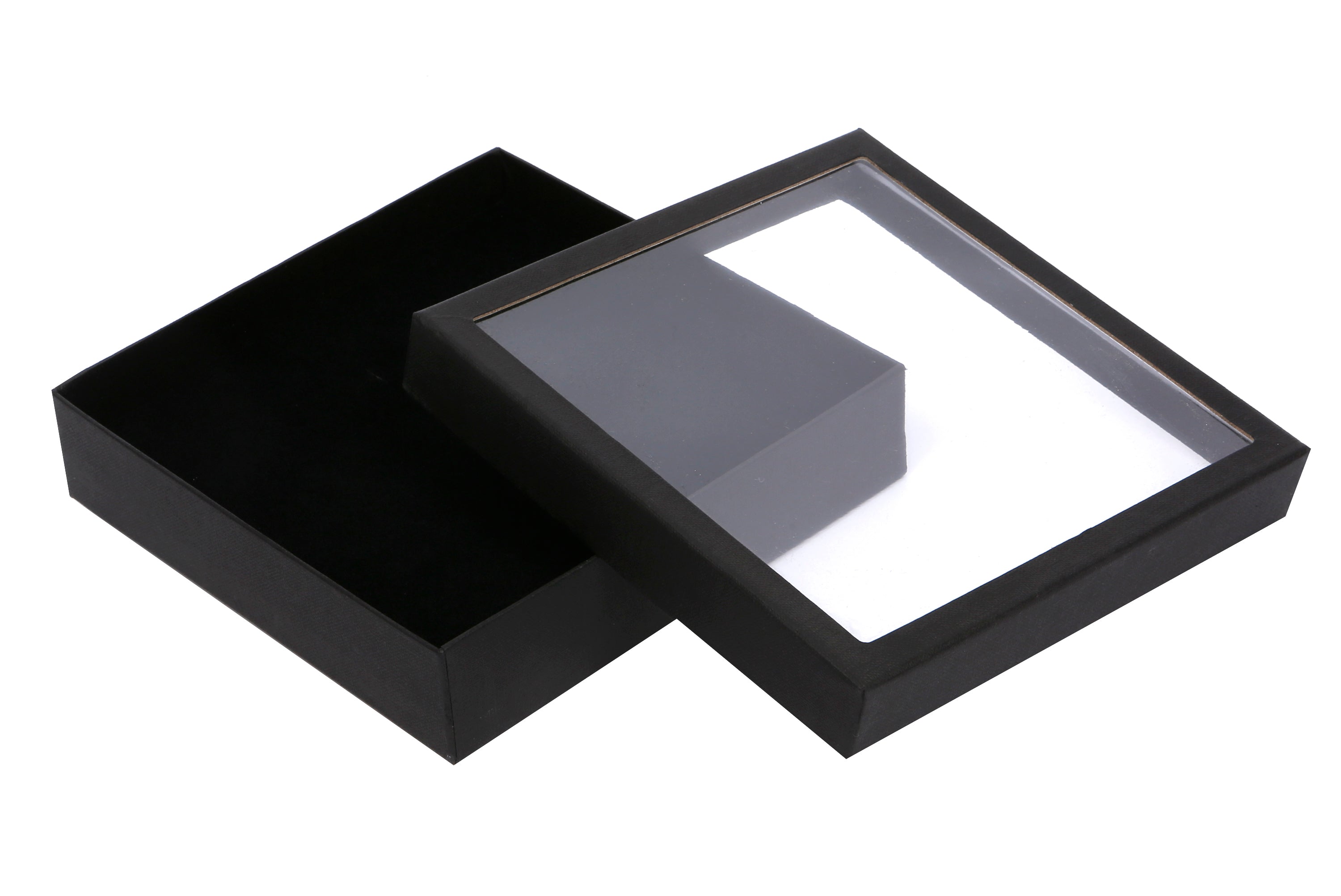 This collection of black covered cardboard jewellery boxes with C’ Thru lid are a great way for keeping your jewellery contained inside free from dirt, dust and being handled. The C’ Thru lid is ideal for displaying the items inside in an environment where its not possible to physically handle the product. The boxes are covered in a black weave embossed paper, are black lined and in the base there is a double-sided colour velvet pad. One side black and the other white. They have a variety of cuts and holes to suit most styles of jewellery. Personalisation is available on the narrow border around the lid of the box, as well as the acetate window, if required.