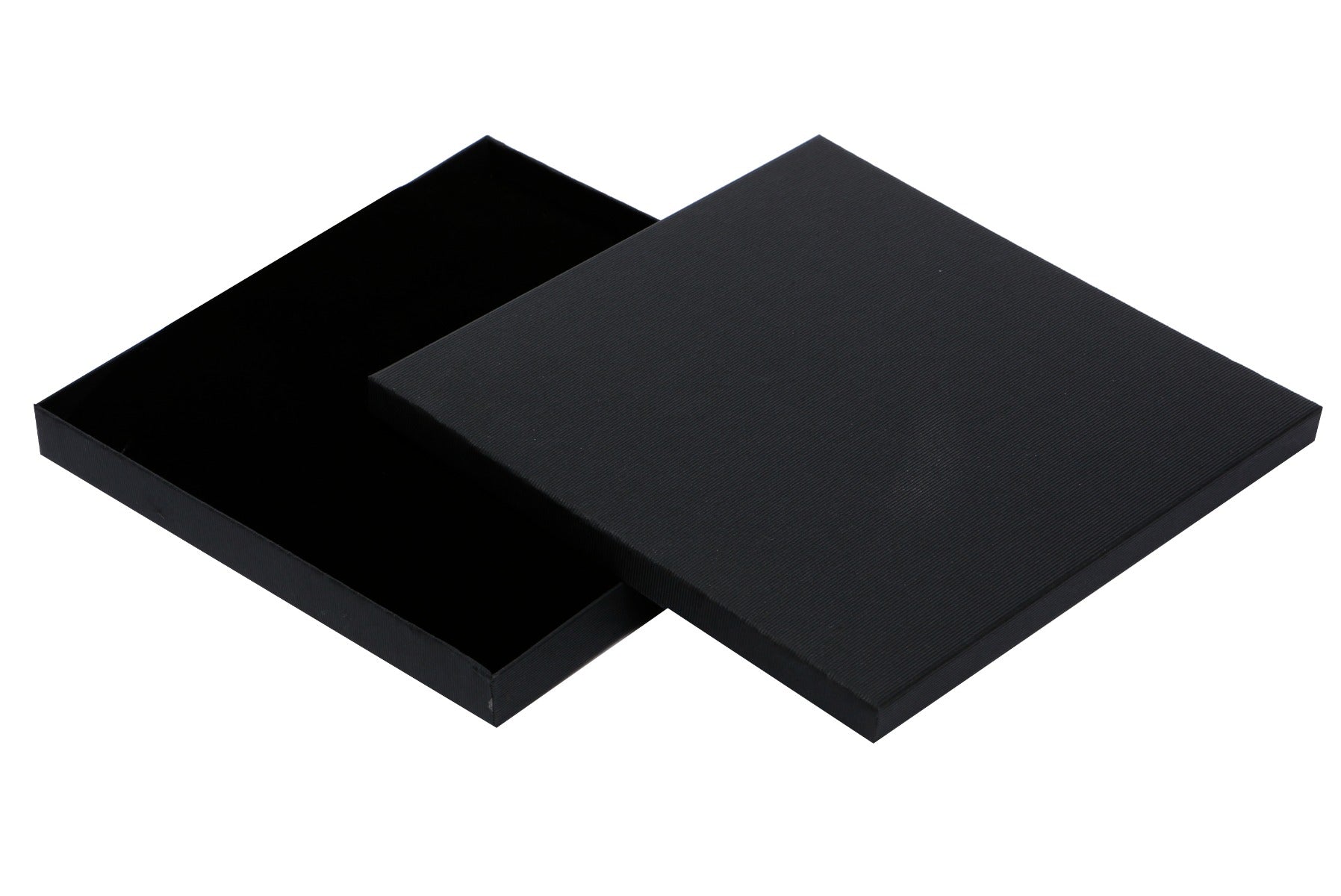 A fantastic value cardboard collection of jewellery boxes with a depth of 18mm. These Thinline jewellery boxes are made up of a lid and base and are covered in a superior quality black ribbed paper. The boxes are black lined and there is a 3mm thickness black velvet covered foam in the base. These base pads have a variety of slits & holes to hold all manner of jewellery. They are bulk packed and offer excellent value for money.The boxes can be printed and personalised on the outer lid of the box. The 18mm depth allows these jewellery boxes to be posted using the Royal Mail Large Letter Post saving huge amounts on postage. An advantage for all mail order and online companies looking to save on Postage both here in the UK, as well as in Germany and Norway.